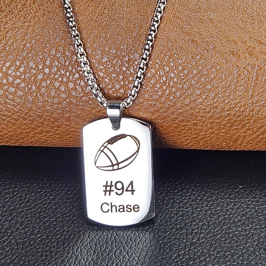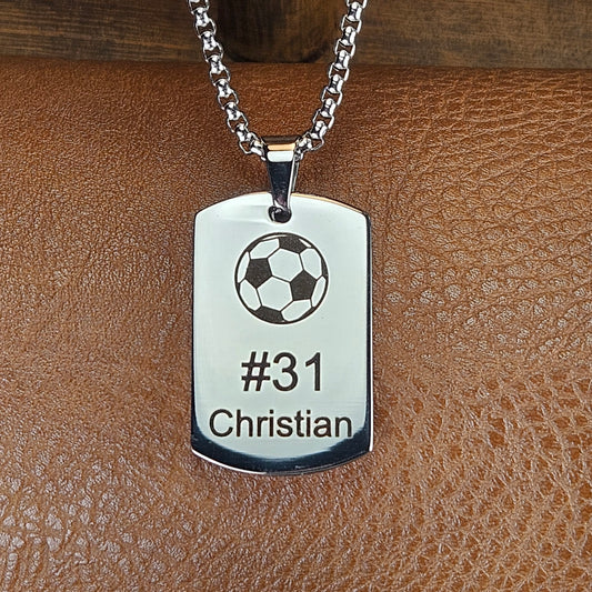 Small Dog Tag with a Soccer ball, Number and Name Necklace