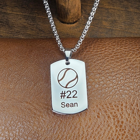 Small Dog Tag with a Baseball, Number and Name Necklace
