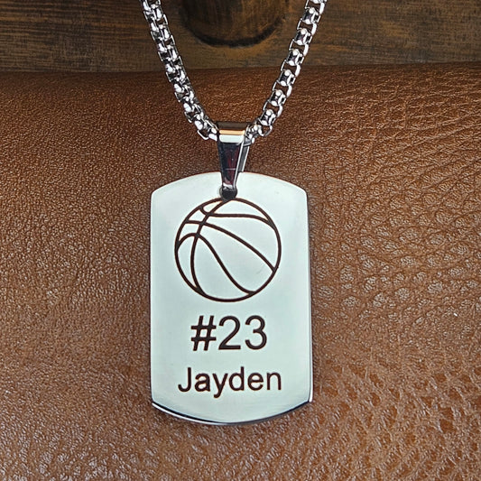 Small Dog Tag with a Basketball, Number and Name Necklace