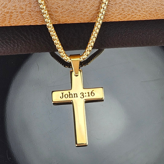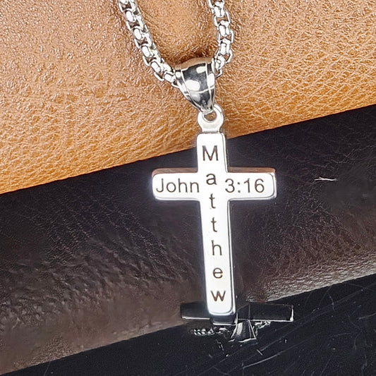 Engraved Large Tapered Cross Stainless Steel Necklace