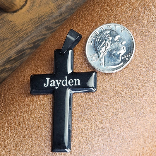 Engraved Large Black Tapered Cross Stainless Steel Necklace