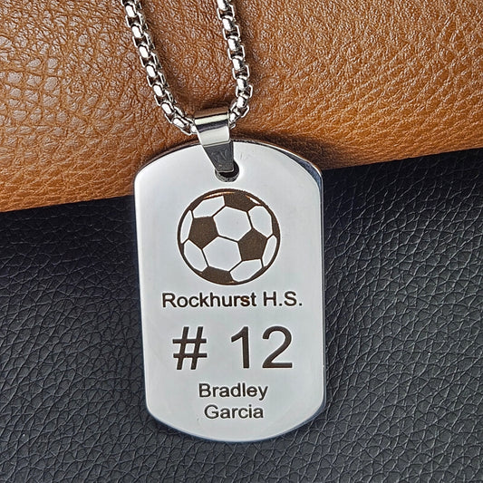 Large Dog Tag with a Soccer Ball, School, Number and Name Necklace