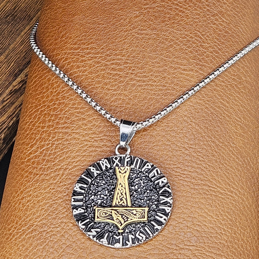 Runes with Hammer Medallion Two Sided Stainless Steel Necklace